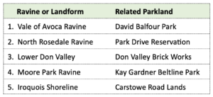Toronto calls itself a city within a park. A visit to North Rosedale demonstrates why this is such an appropriate motto. Ravine lands are the signature feature of Toronto’s green spaces, and our neighbourhood is bounded by ravines and related landforms in all directions (see map below). These include the Vale of Avoca, the Park Drive Lands, and the Moore Park Ravine which leads directly to the magnificent Lower Don Valley. The northern boundary of our neighbourhood is the Lake Iroquois Shoreline, an escarpment that formed the shore of a giant lake that existed briefly as the glaciers receded 13,000 years ago. These green spaces play a critical role in maintaining biodiversity and mitigating the impact of climate change, while providing recreational opportunities critical to the well-being of all of us.