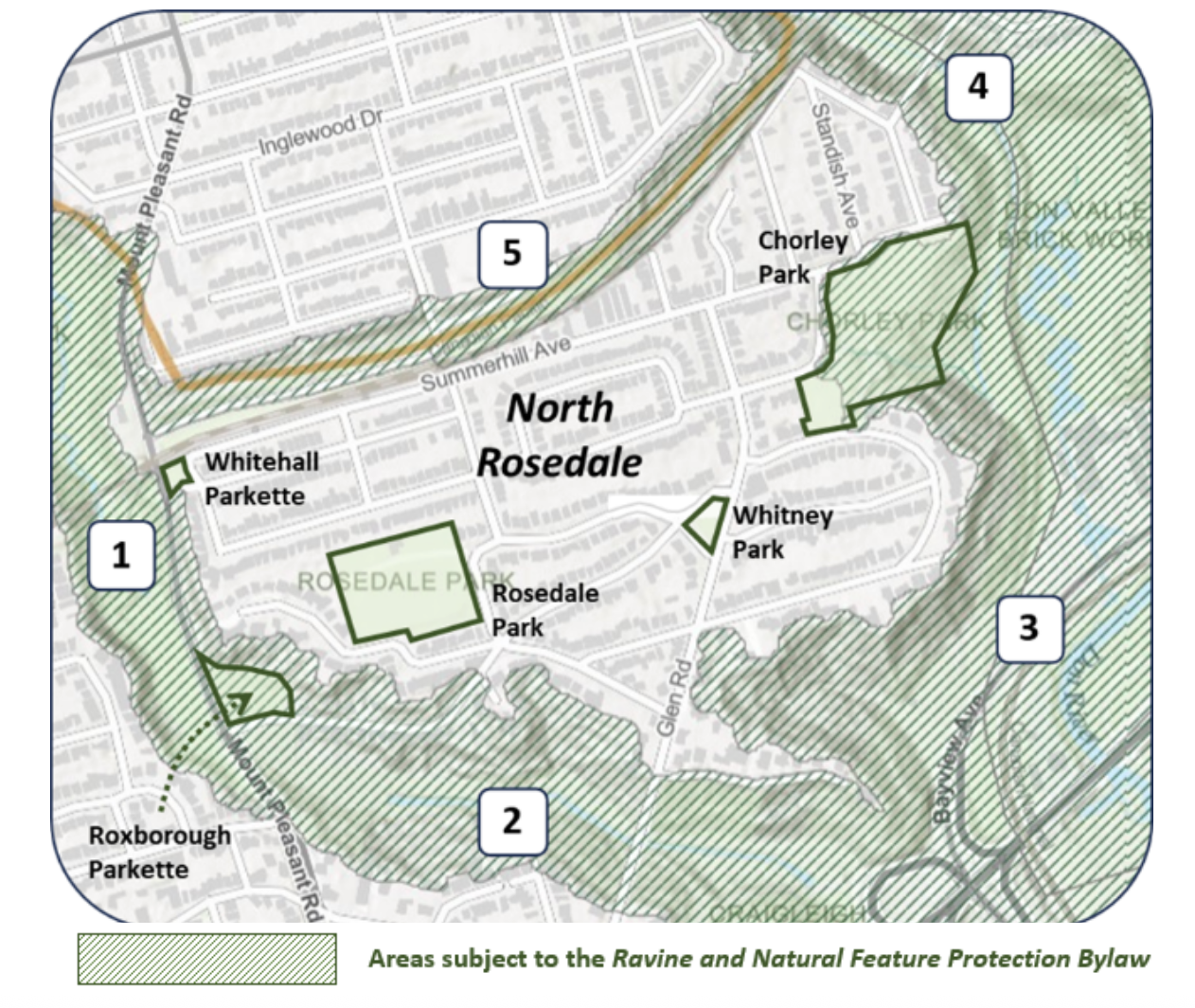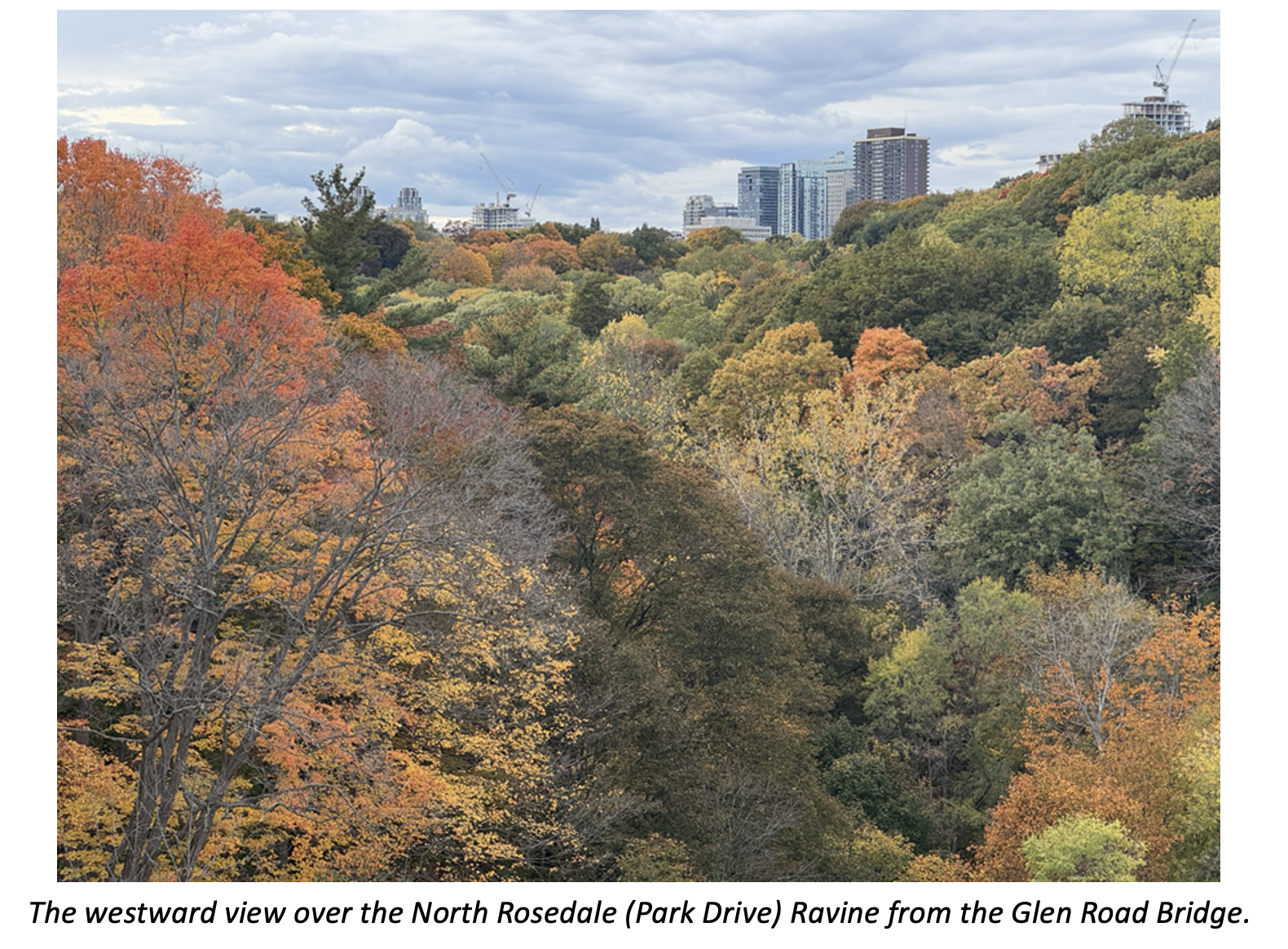 Toronto calls itself a city within a park. A visit to North Rosedale demonstrates why this is such an appropriate motto. Ravine lands are the signature feature of Toronto’s green spaces, and our neighbourhood is bounded by ravines and related landforms in all directions (see map below). These include the Vale of Avoca, the Park Drive Lands, and the Moore Park Ravine which leads directly to the magnificent Lower Don Valley. The northern boundary of our neighbourhood is the Lake Iroquois Shoreline, an escarpment that formed the shore of a giant lake that existed briefly as the glaciers receded 13,000 years ago. These green spaces play a critical role in maintaining biodiversity and mitigating the impact of climate change, while providing recreational opportunities critical to the well-being of all of us.