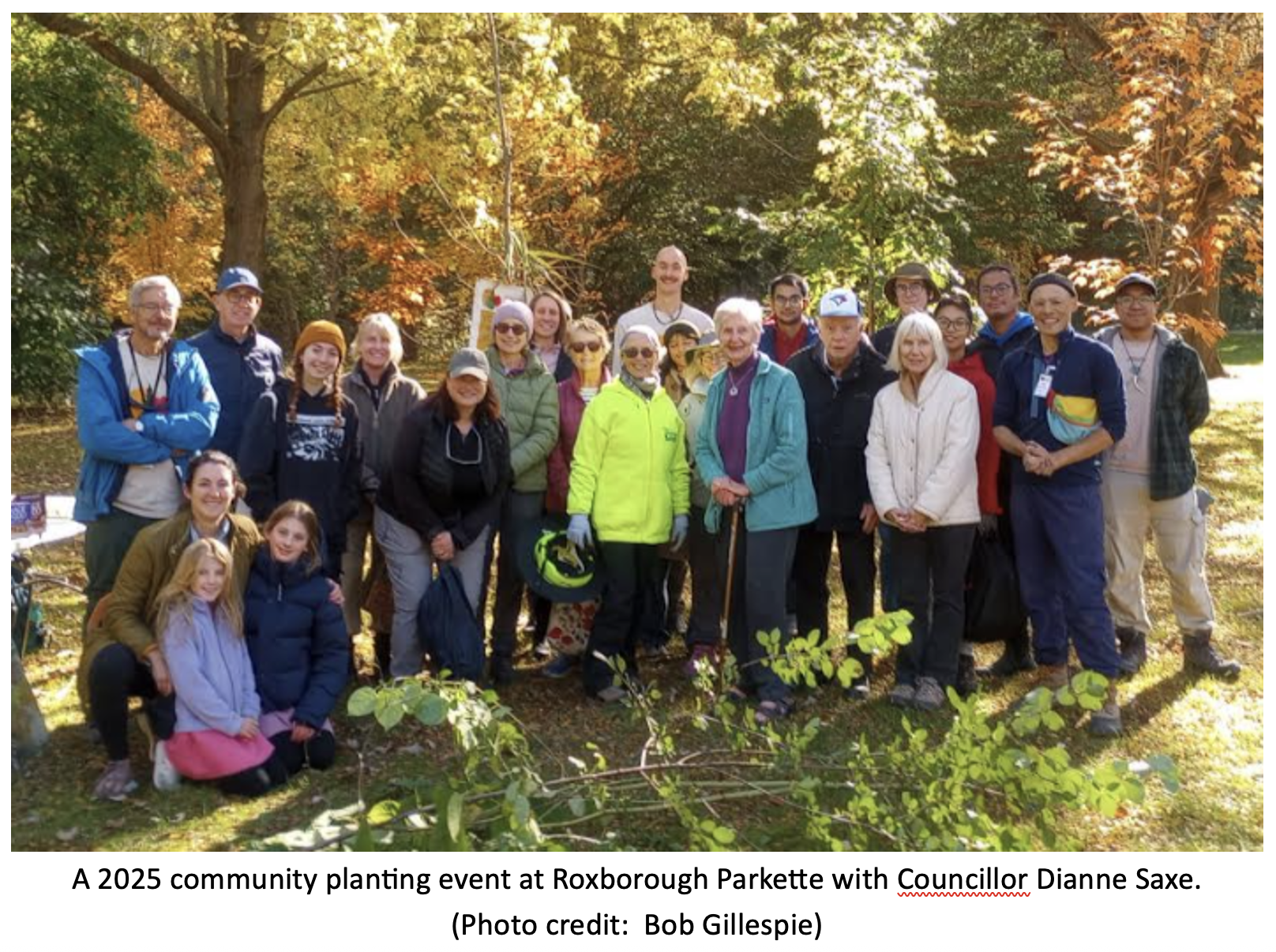 The NRRA has been please to support local stewardship efforts, including continuing work in Roxborough Parkette by volunteers coordinated by Toronto Nature Stewards under an agreement with the City. In 2019, the NRRA coordinated community volunteers for tree and shrub planting in Chorley Park, in order to re-naturalize the trails connecting the park with the ravine system.